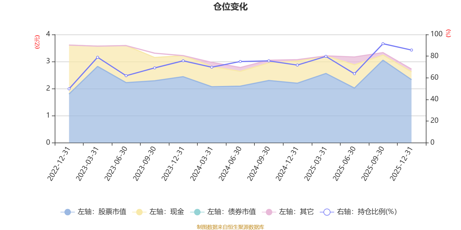 据定期报告数据统计,近三年平均股票仓位为74.88%,同类平均为87.15%。2025年三季度末基金达到91.5%的最高仓位,2022年末最低,为49.79%。