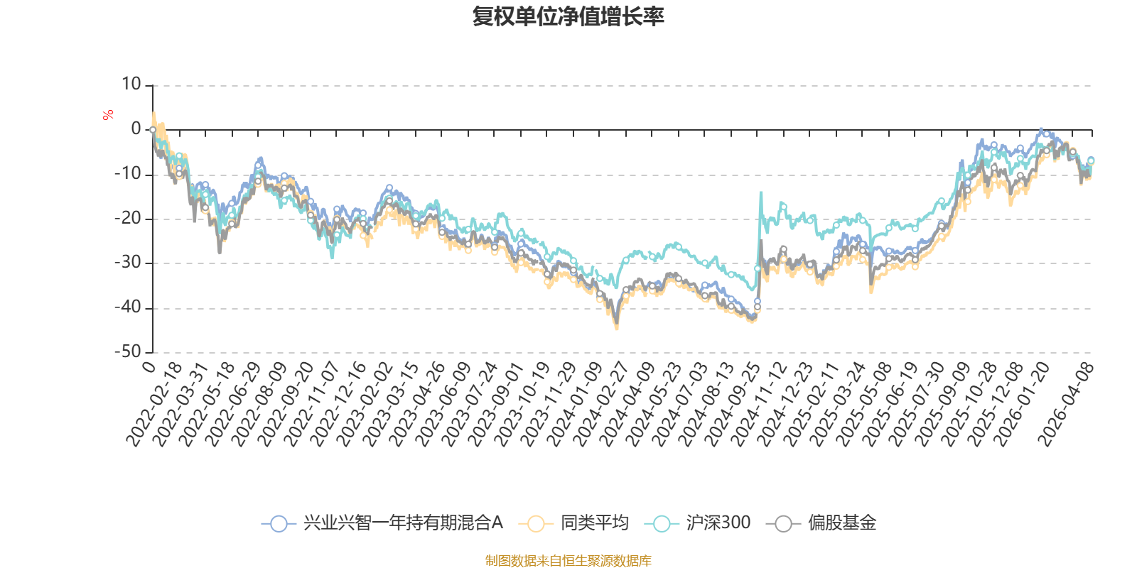 截至4月8日,兴业兴智一年持有期混合A近三个月复权单位净值增长率为-5.57%,位于同类可比基金232/265;近半年复权单位净值增长率为-4.16%,位于同类可比基金213/265;近一年复权单位净值增长率为32.07%,位于同类可比基金182/265;近三年复权单位净值增长率为12.63%,位于同类可比基金153/261。