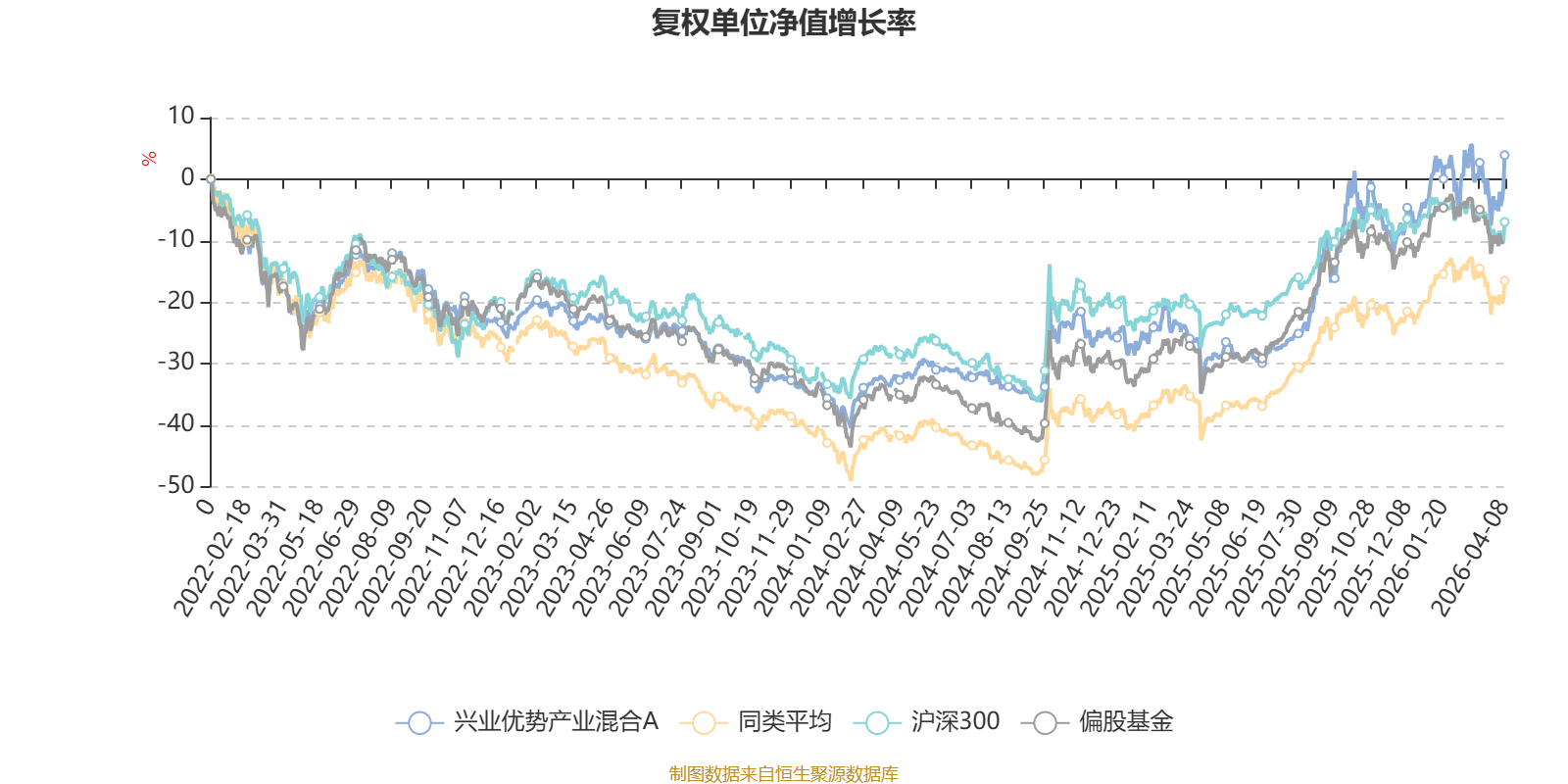 截至4月8日,兴业优势产业混合A近三个月复权单位净值增长率为3.04%,位于同类可比基金208/689;近半年复权单位净值增长率为4.39%,位于同类可比基金296/689;近一年复权单位净值增长率为54.22%,位于同类可比基金199/685;近三年复权单位净值增长率为33.86%,位于同类可比基金96/417。