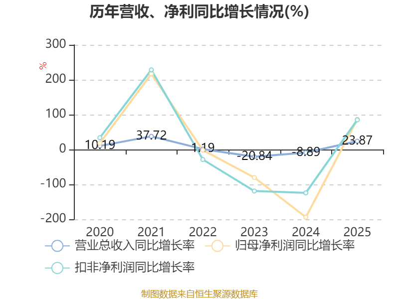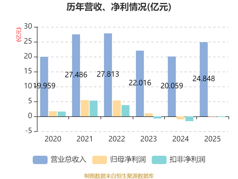 中证智能财讯山东玻纤(605006)4月9日披露2025年年度报告。2025年,公司实现营业总收入24.85亿元,同比增长23.87%;归母净利润亏损1343.21万元,上年同期亏损9893.05万元;扣非净利润亏损2414.54万元,上年同期亏损1.61亿元;经营活动产生的现金流量净额为-5802.09万元,上年同期为1.62亿元;报告期内,山东玻纤基本每股收益为-0.02元,加权平均净资产收益率为-0.51%。