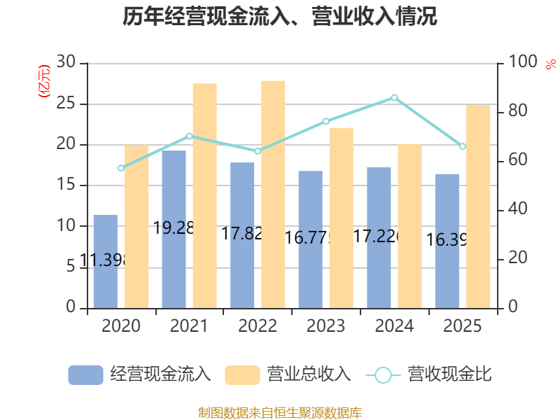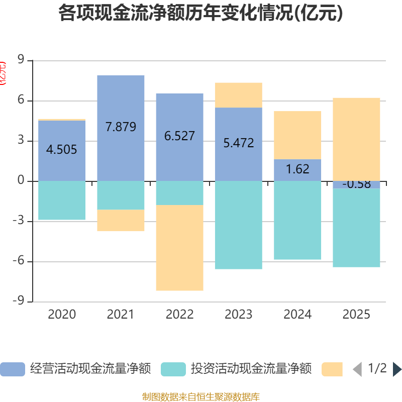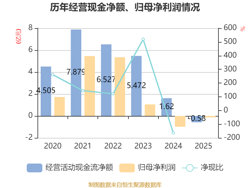 截至2025年,公司经营活动现金流净额为-5802.09万元,同比减少2.2亿元;筹资活动现金流净额6.19亿元,同比增加2.6亿元;投资活动现金流净额-5.86亿元,上年同期为-5.87亿元。