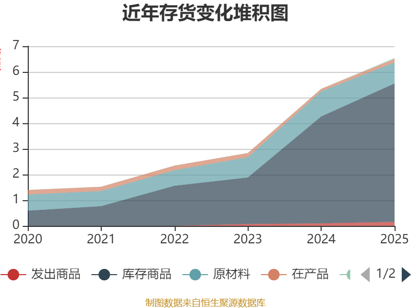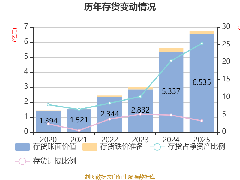 从存货变动来看,截至2025年末,公司存货账面价值为6.53亿元,占净资产的25.29%,较上年末增加1.2亿元。其中,存货跌价准备为2167.44万元,计提比例为3.21%。