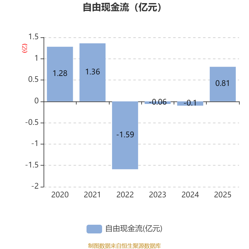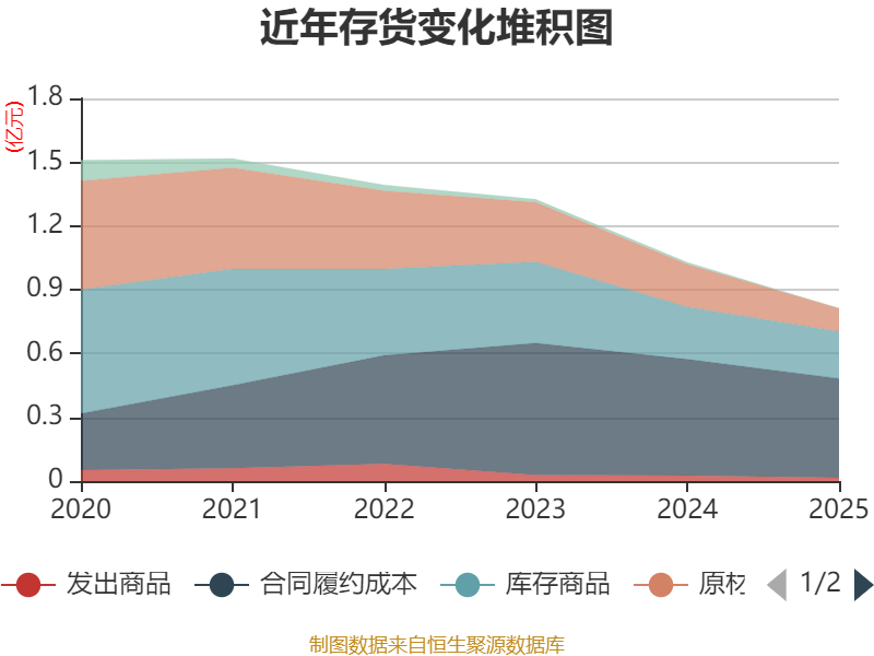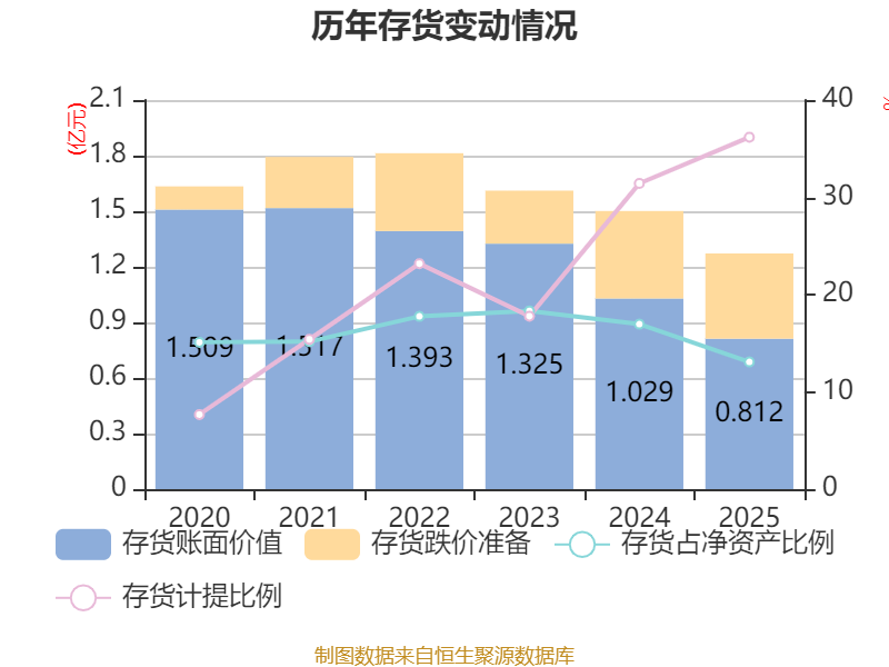 从存货变动来看,截至2025年末,公司存货账面价值为8115.43万元,占净资产的13.08%,较上年末减少2172.53万元。其中,存货跌价准备为4600.97万元,计提比例为36.18%。