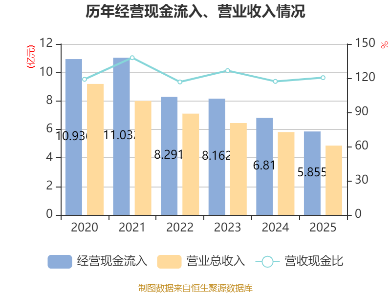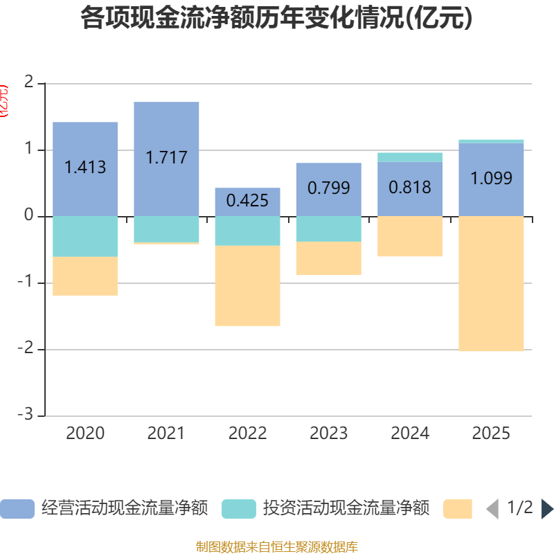 截至2025年,公司经营活动现金流净额为1.1亿元,同比增长34.29%;筹资活动现金流净额-2.03亿元,同比减少1.43亿元;投资活动现金流净额497.8万元,上年同期为1350.22万元。