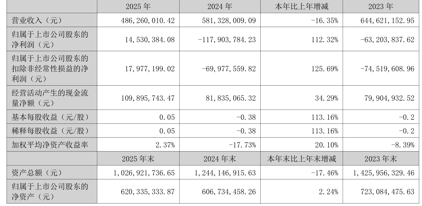 中证智能财讯阳普医疗(300030)4月9日披露2025年年度报告。2025年,公司实现营业总收入4.86亿元,同比下降16.35%;归母净利润1453.04万元,同比扭亏;扣非净利润1797.72万元,同比扭亏;经营活动产生的现金流量净额为1.1亿元,同比增长34.29%;报告期内,阳普医疗基本每股收益为0.05元,加权平均净资产收益率为2.37%。