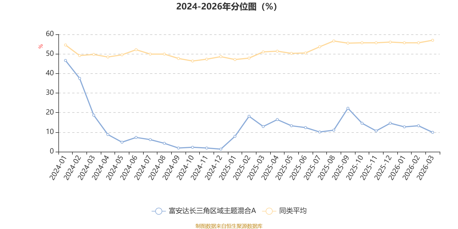 通过所选区间该基金净值增长率分位图,可以观察该基金与同类基金业绩比较情况。图为坐标原点到区间内某时点的净值增长率在同类基金中的分位数。