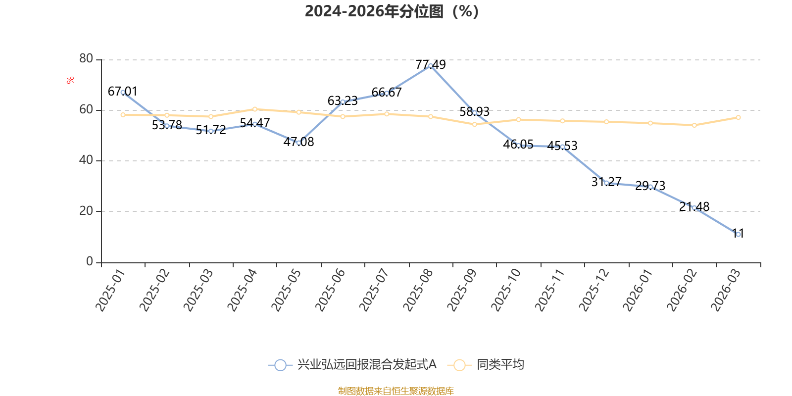 通过所选区间该基金净值增长率分位图,可以观察该基金与同类基金业绩比较情况。图为坐标原点到区间内某时点的净值增长率在同类基金中的分位数。
