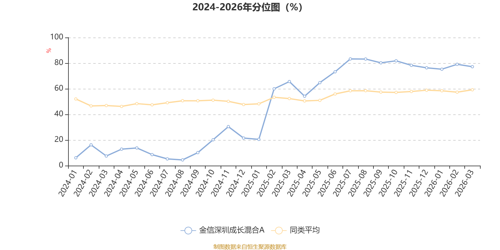 通过所选区间该基金净值增长率分位图,可以观察该基金与同类基金业绩比较情况。图为坐标原点到区间内某时点的净值增长率在同类基金中的分位数。