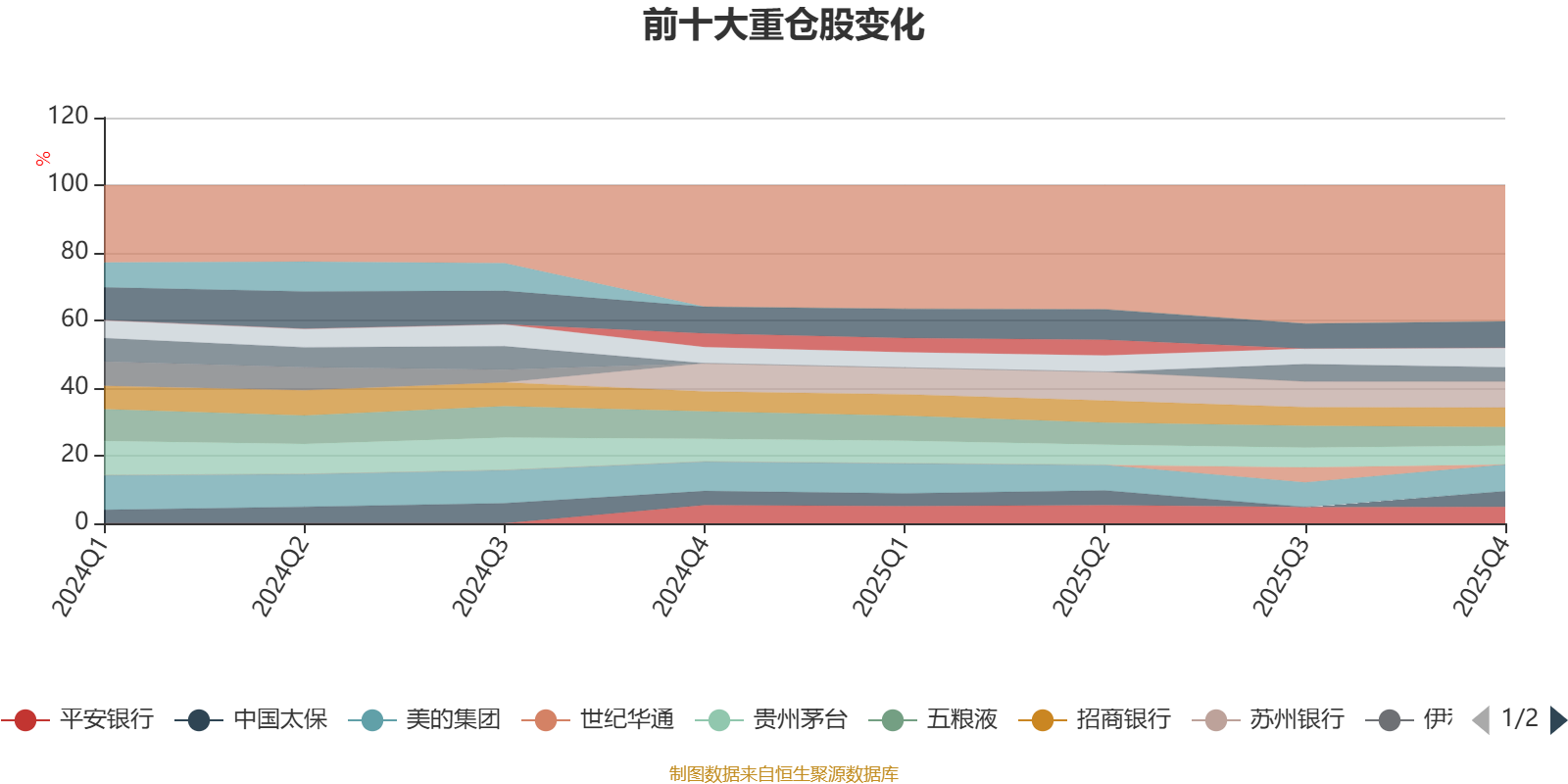 该基金持股集中度较高,且持股标的较为稳定。截至2025年末,基金十大重仓股分别是美的集团、兴业银行、苏州银行、招商银行、中国平安、贵州茅台、五粮液、平安银行、中国太保、恒瑞医药。