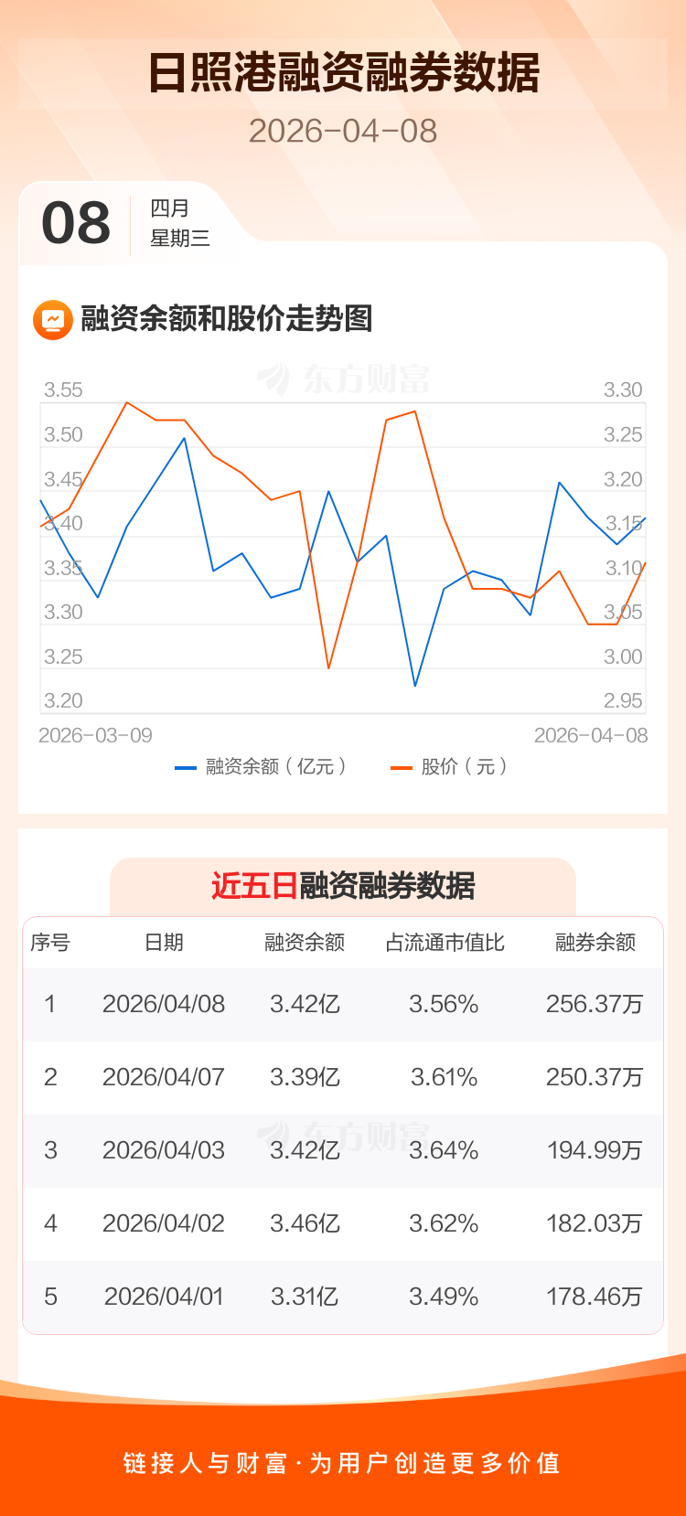 交易所最新数据显示,日照港于2026年4月8日获融资买入2417.50万元,融资偿还2145.22万元,当日融资净买入272.27万元。目前,该股融资余额3.42亿,占流通市值比例为3.56%。