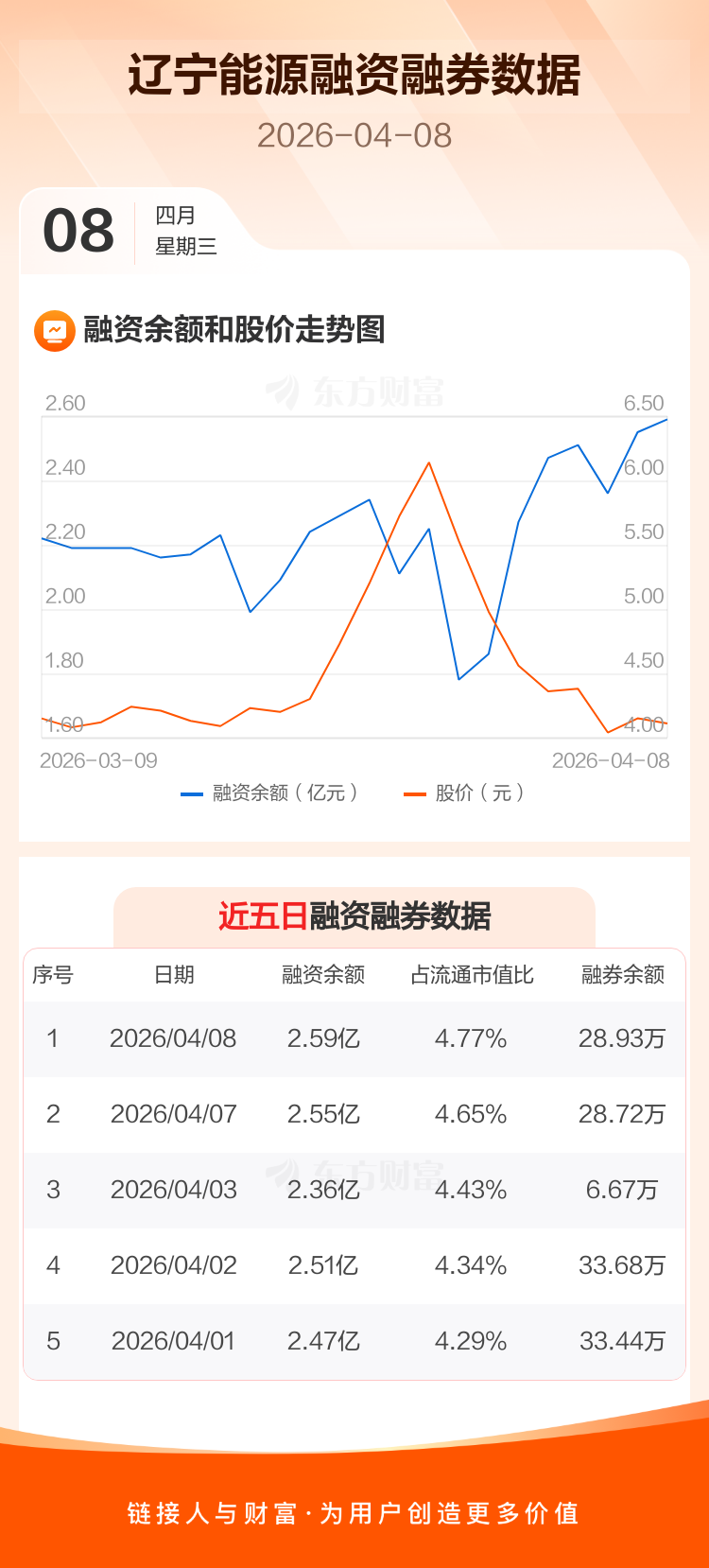 交易所最新数据显示,辽宁能源于2026年4月8日获融资买入4655.01万元,融资偿还4246.24万元,当日融资净买入408.77万元。目前,该股融资余额2.59亿,占流通市值比例为4.77%。