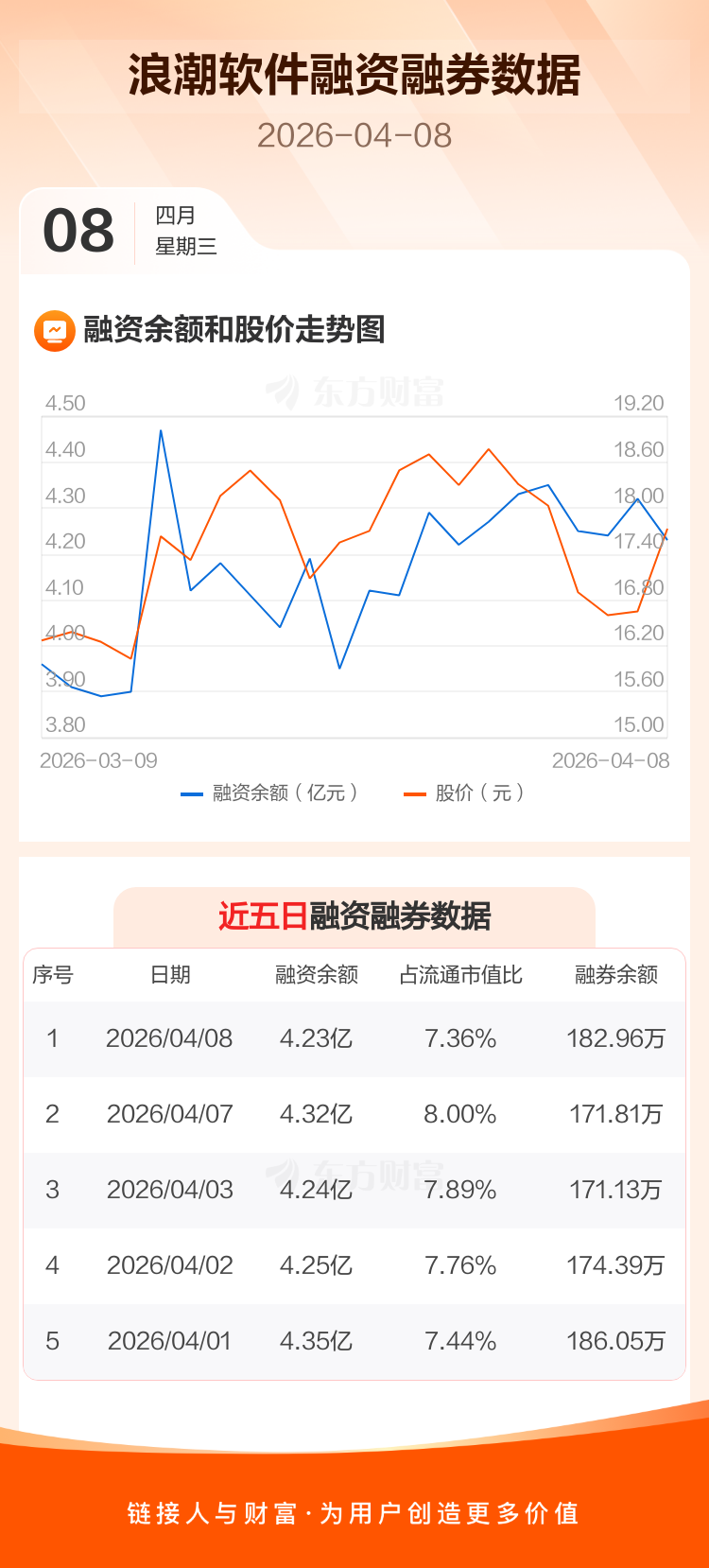 交易所最新数据显示,浪潮软件于2026年4月8日获融资买入4342.12万元,融资偿还5203.29万元,当日融资净偿还861.18万元。目前,该股融资余额4.23亿,占流通市值比例为7.36%。