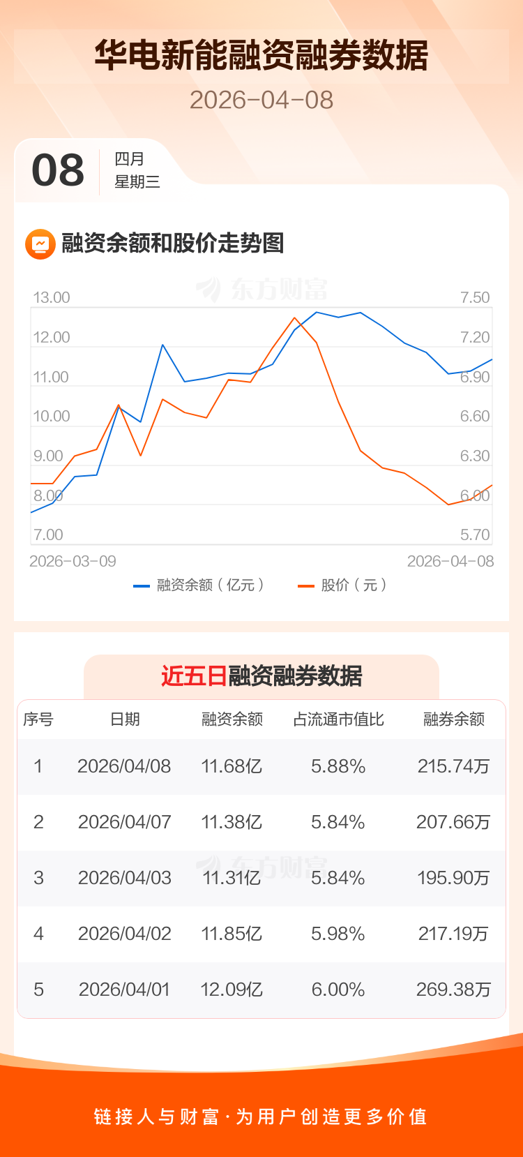 交易所最新数据显示,华电新能于2026年4月8日获融资买入1.27亿元,融资偿还9717.16万元,当日融资净买入2968.87万元。目前,该股融资余额11.68亿,占流通市值比例为5.88%。