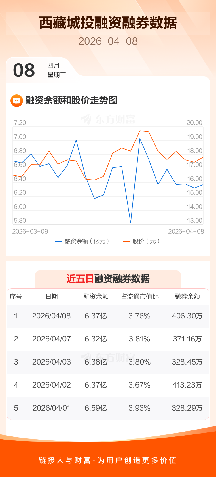 交易所最新数据显示,西藏城投于2026年4月8日获融资买入3386.62万元,融资偿还2916.91万元,当日融资净买入469.7万元。目前,该股融资余额6.37亿,占流通市值比例为3.76%。