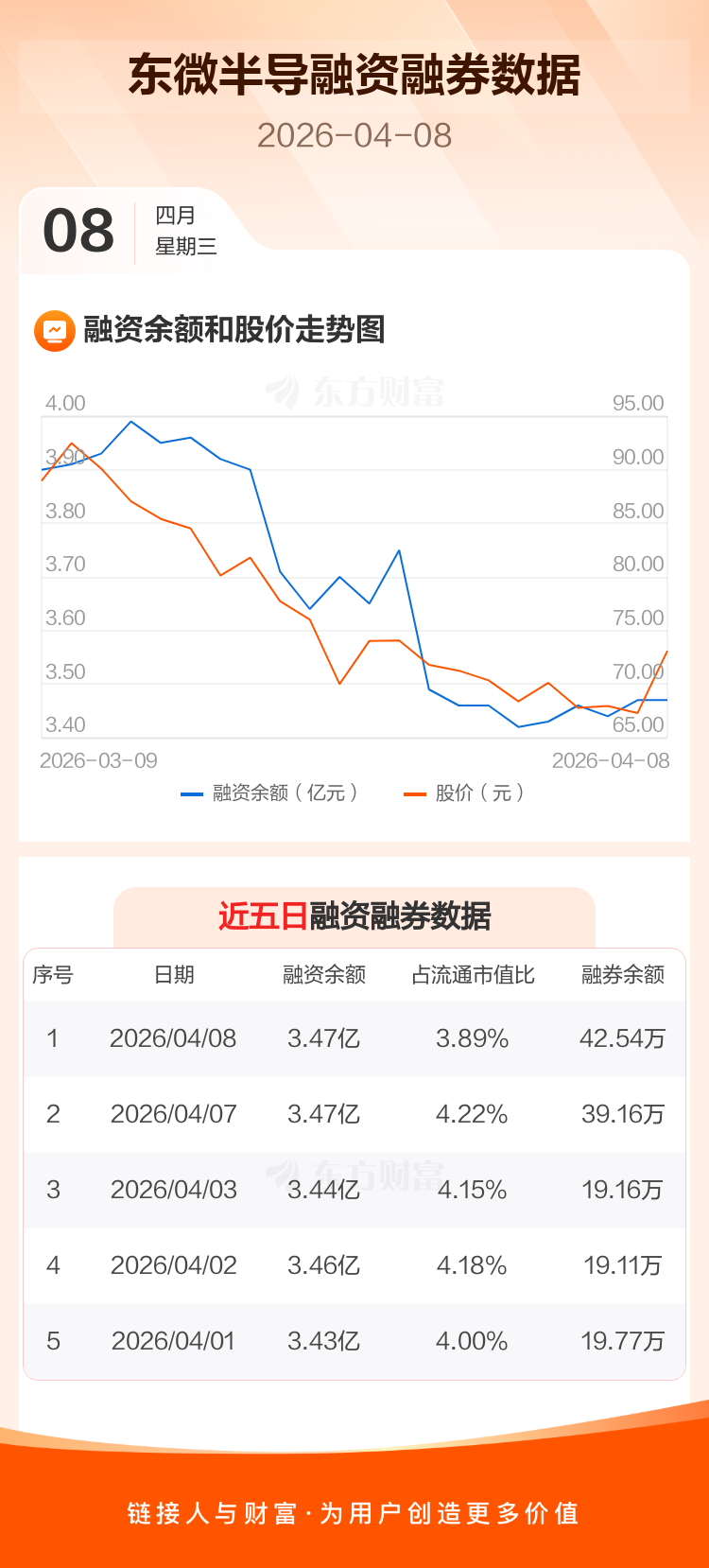 交易所最新数据显示,东微半导于2026年4月8日获融资买入3321.24万元,融资偿还3343.25万元,当日融资净偿还22.01万元。目前,该股融资余额3.47亿,占流通市值比例为3.89%。
