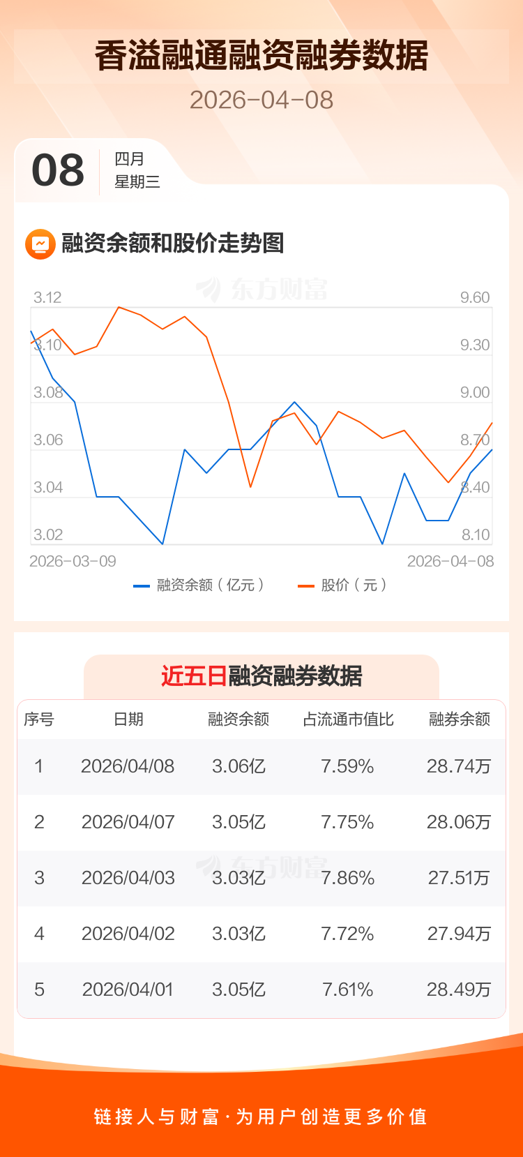 交易所最新数据显示,香溢融通于2026年4月8日获融资买入615.96万元,融资偿还521.06万元,当日融资净买入94.9万元。目前,该股融资余额3.06亿,占流通市值比例为7.59%。