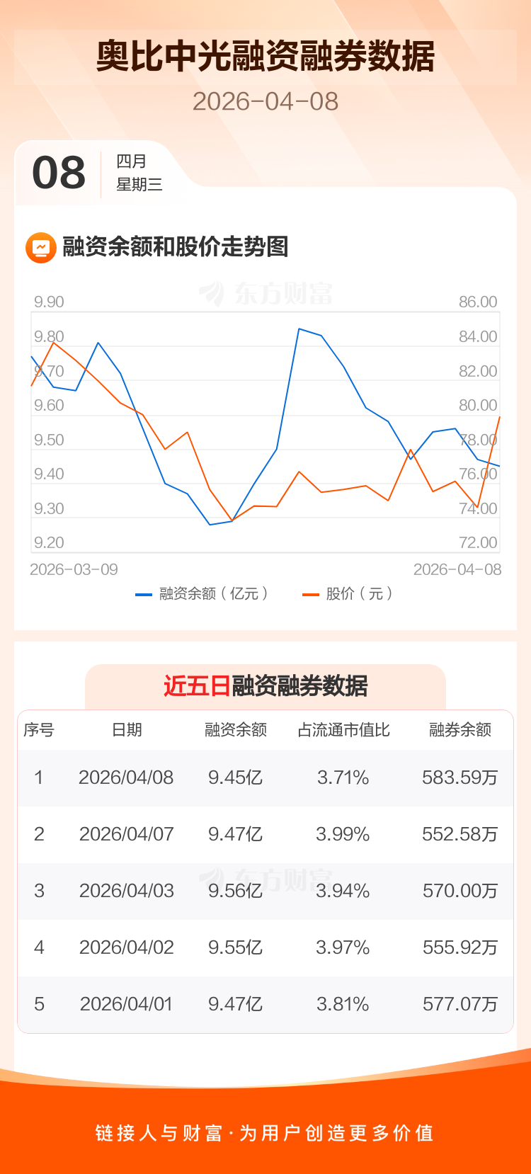 交易所最新数据显示,奥比中光于2026年4月8日获融资买入5527.57万元,融资偿还5812.36万元,当日融资净偿还284.79万元。目前,该股融资余额9.45亿,占流通市值比例为3.71%。
