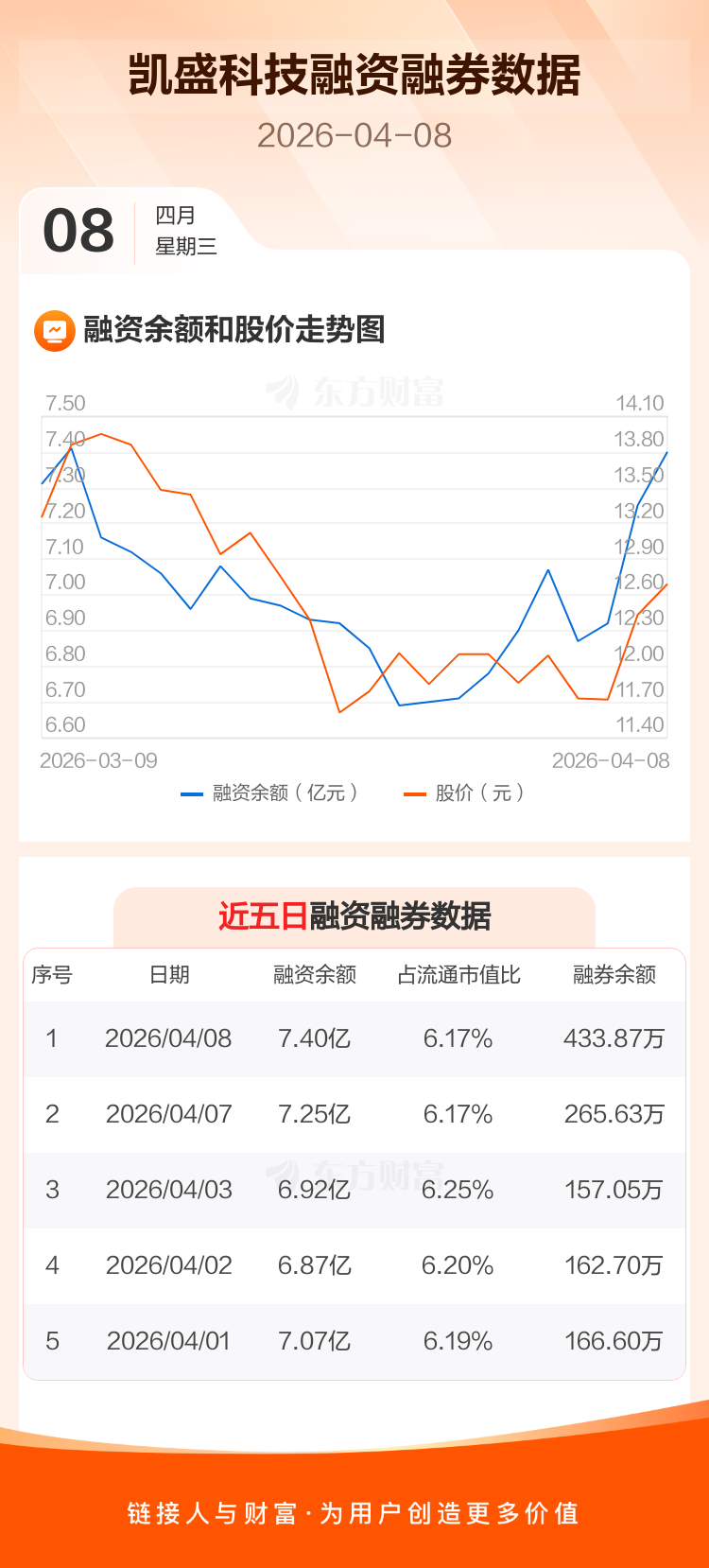 交易所最新数据显示,凯盛科技于2026年4月8日获融资买入9121.45万元,融资偿还7623.24万元,当日融资净买入1498.21万元。目前,该股融资余额7.40亿,占流通市值比例为6.17%。