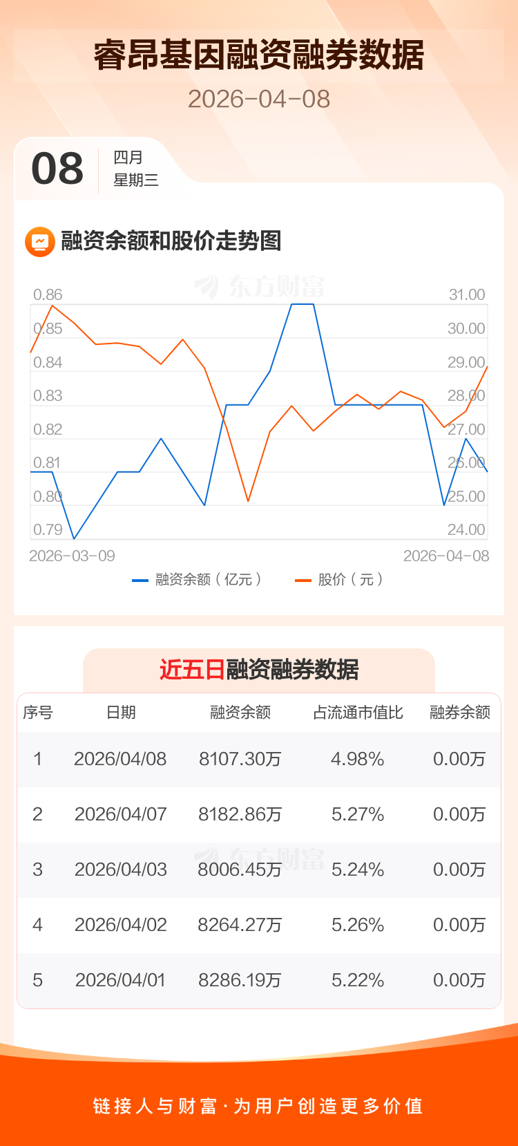 交易所最新数据显示,睿昂基因于2026年4月8日获融资买入203.59万元,融资偿还279.15万元,当日融资净偿还75.56万元。目前,该股融资余额8107.30万,占流通市值比例为4.98%。