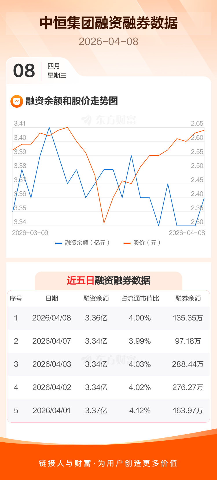 交易所最新数据显示,中恒集团于2026年4月8日获融资买入2193.99万元,融资偿还2037.80万元,当日融资净买入156.19万元。目前,该股融资余额3.36亿,占流通市值比例为4.00%。