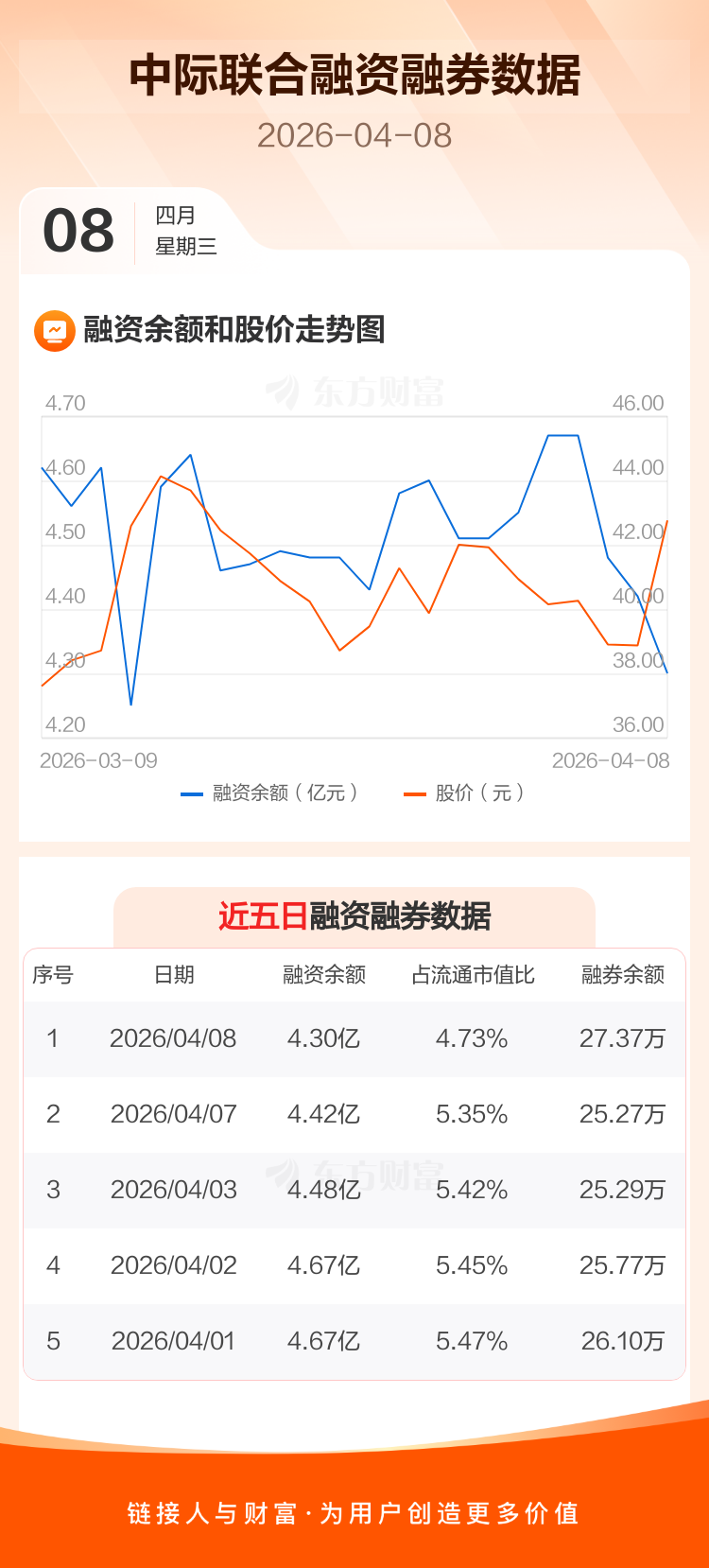 交易所最新数据显示,中际联合于2026年4月8日获融资买入3664.96万元,融资偿还4838.25万元,当日融资净偿还1173.29万元。目前,该股融资余额4.30亿,占流通市值比例为4.73%。