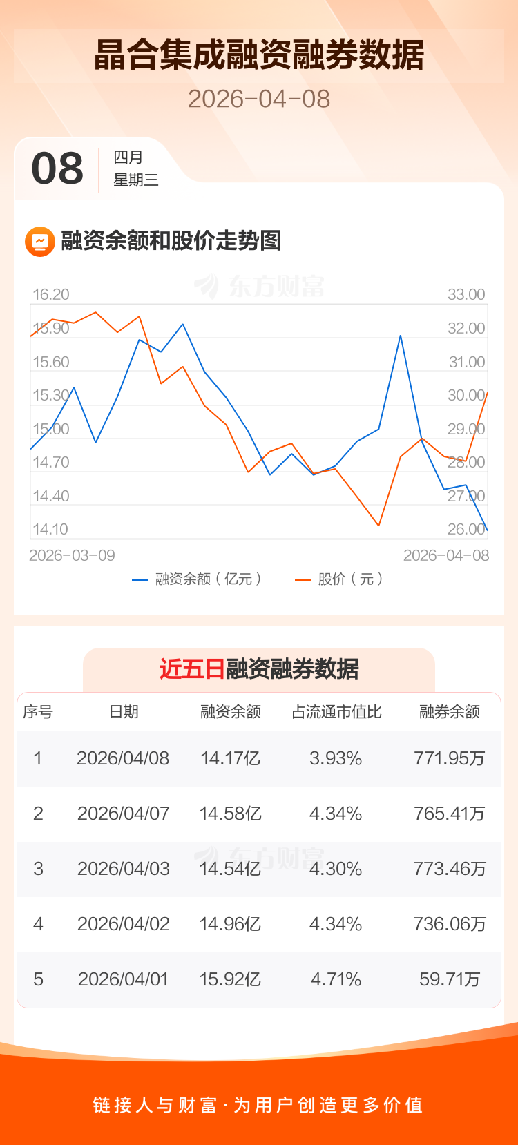 交易所最新数据显示,晶合集成于2026年4月8日获融资买入1.02亿元,融资偿还1.43亿元,当日融资净偿还4115.45万元。目前,该股融资余额14.17亿,占流通市值比例为3.93%。