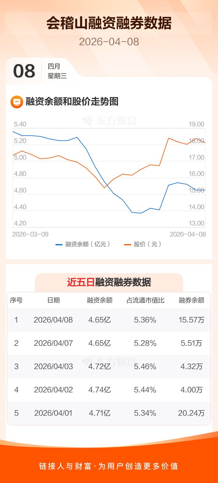 交易所最新数据显示,会稽山于2026年4月8日获融资买入1907.37万元,融资偿还1894.80万元,当日融资净买入12.57万元。目前,该股融资余额4.65亿,占流通市值比例为5.36%。