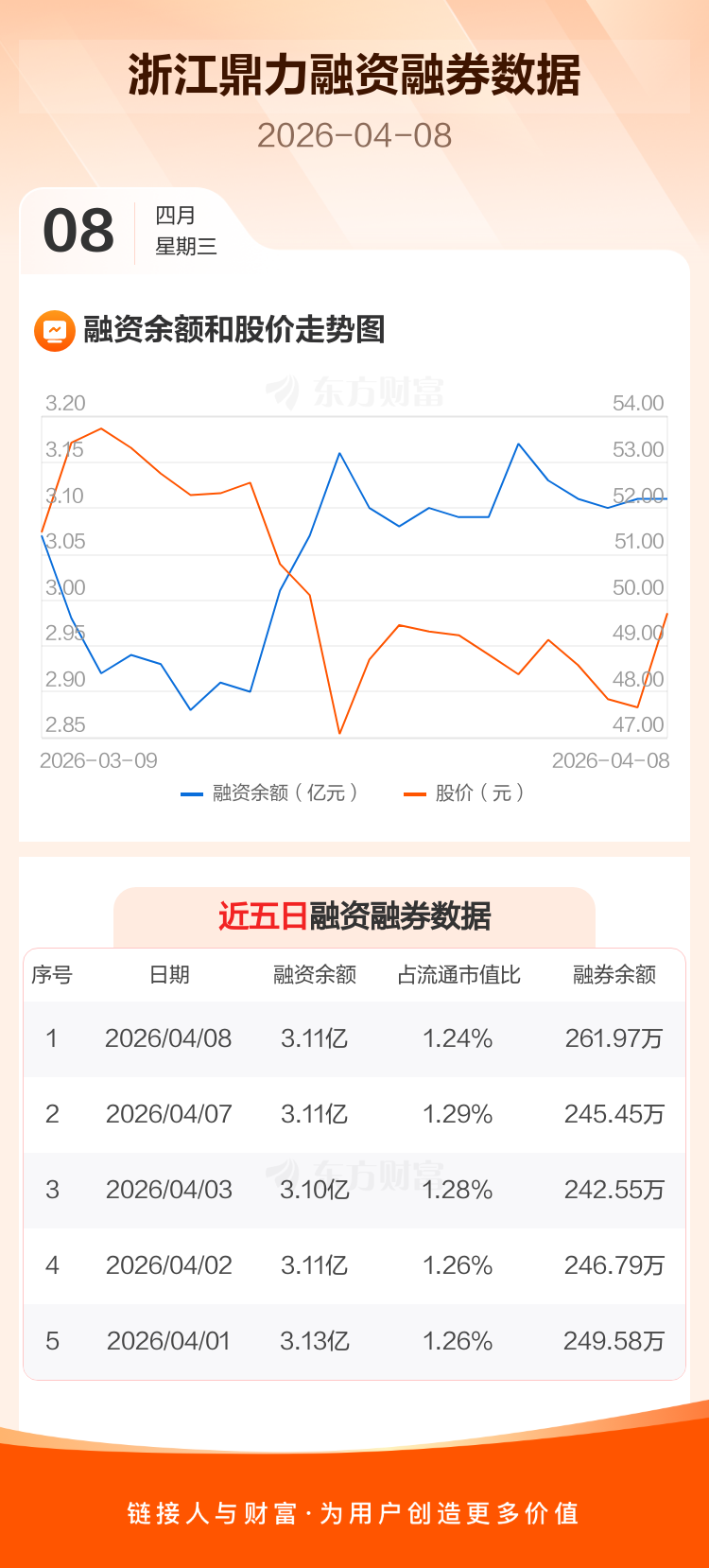 交易所最新数据显示,浙江鼎力于2026年4月8日获融资买入1414.86万元,融资偿还1392.06万元,当日融资净买入22.8万元。目前,该股融资余额3.11亿,占流通市值比例为1.24%。