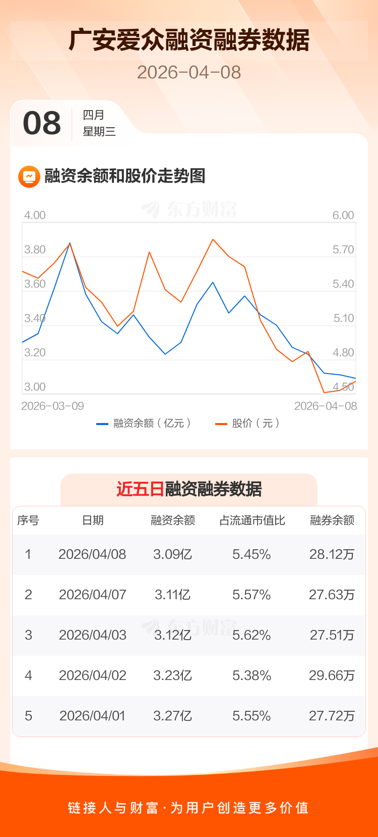 交易所最新数据显示,广安爱众于2026年4月8日获融资买入2060.41万元,融资偿还2225.46万元,当日融资净偿还165.05万元。目前,该股融资余额3.09亿,占流通市值比例为5.45%。
