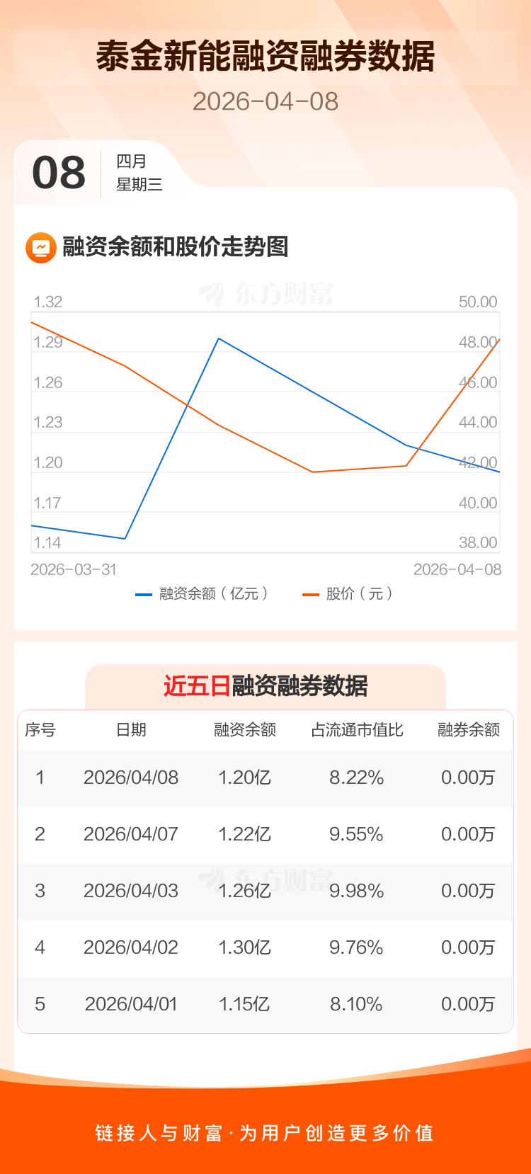交易所最新数据显示,泰金新能于2026年4月8日获融资买入5677.36万元,融资偿还5807.75万元,当日融资净偿还130.39万元。目前,该股融资余额1.20亿,占流通市值比例为8.22%。