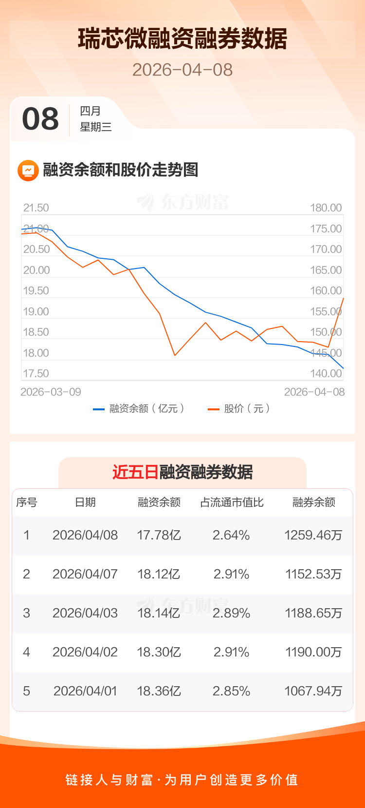 交易所最新数据显示,瑞芯微于2026年4月8日获融资买入1.06亿元,融资偿还1.40亿元,当日融资净偿还3362.25万元。目前,该股融资余额17.78亿,占流通市值比例为2.64%。