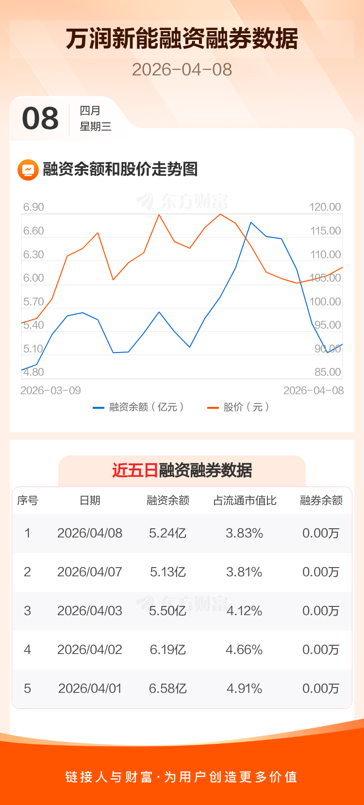 交易所最新数据显示,万润新能于2026年4月8日获融资买入7432.55万元,融资偿还6311.54万元,当日融资净买入1121.01万元。目前,该股融资余额5.24亿,占流通市值比例为3.83%。