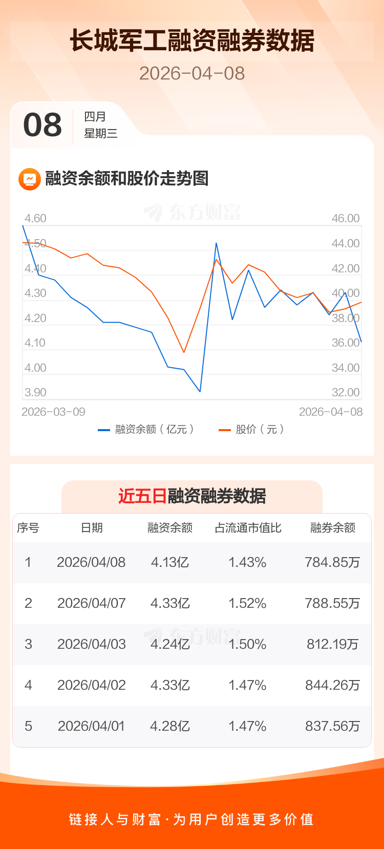 交易所最新数据显示,长城军工于2026年4月8日获融资买入4008.70万元,融资偿还5960.63万元,当日融资净偿还1951.94万元。目前,该股融资余额4.13亿,占流通市值比例为1.43%。
