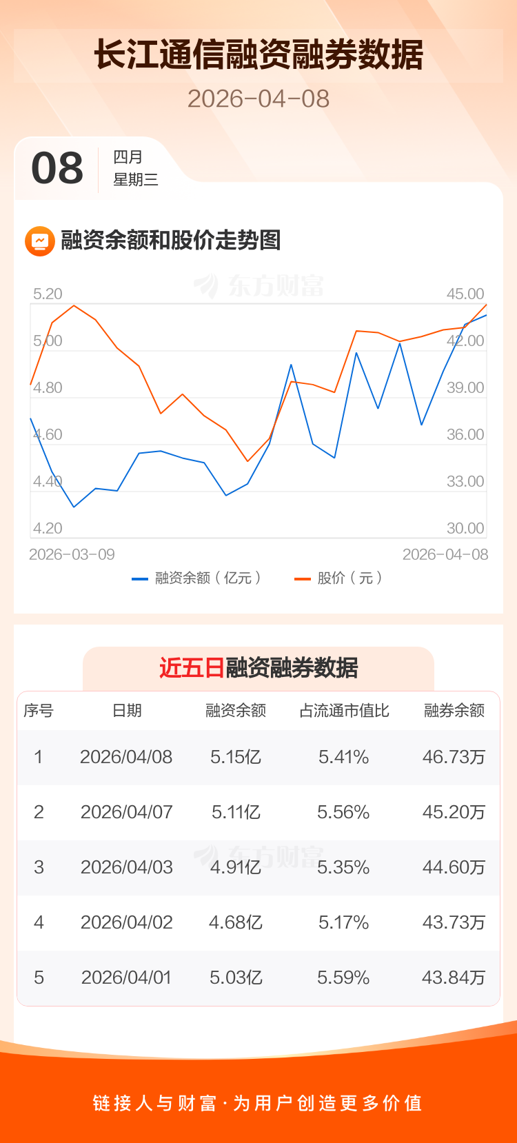 交易所最新数据显示,长江通信于2026年4月8日获融资买入1.33亿元,融资偿还1.29亿元,当日融资净买入356.42万元。目前,该股融资余额5.15亿,占流通市值比例为5.41%。