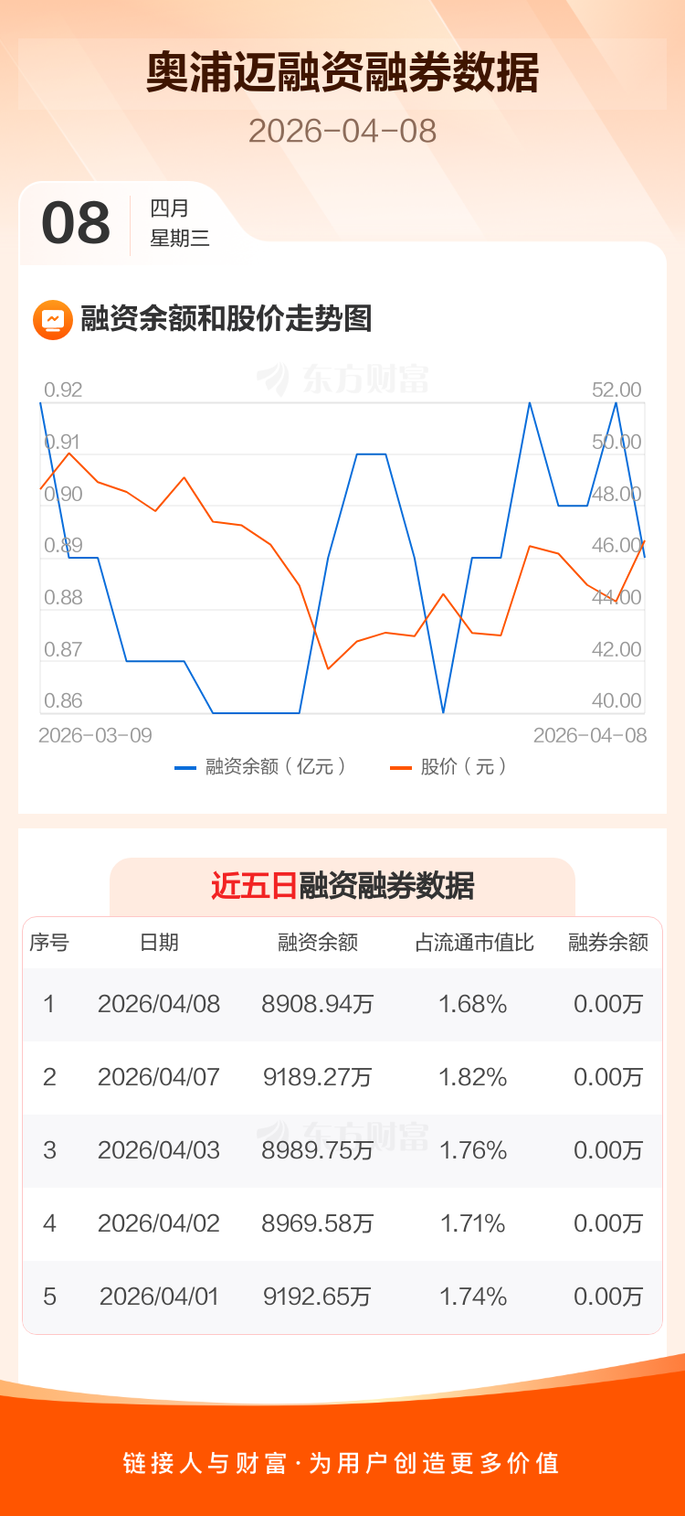 交易所最新数据显示,奥浦迈于2026年4月8日获融资买入333.44万元,融资偿还613.77万元,当日融资净偿还280.33万元。目前,该股融资余额8908.94万,占流通市值比例为1.68%。