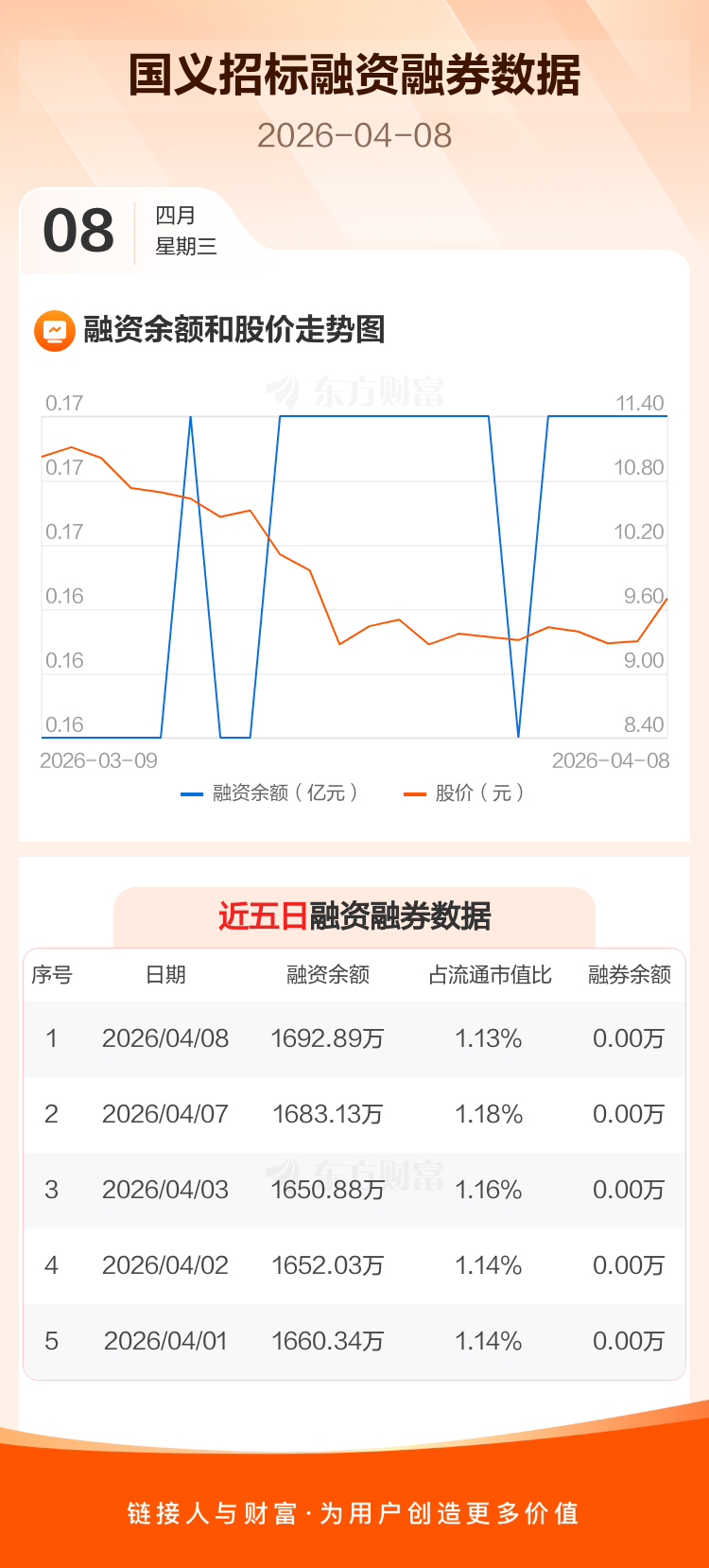 交易所最新数据显示,国义招标于2026年4月8日获融资买入41.24万元,融资偿还31.49万元,当日融资净买入9.75万元。目前,该股融资余额1692.89万,占流通市值比例为1.13%。