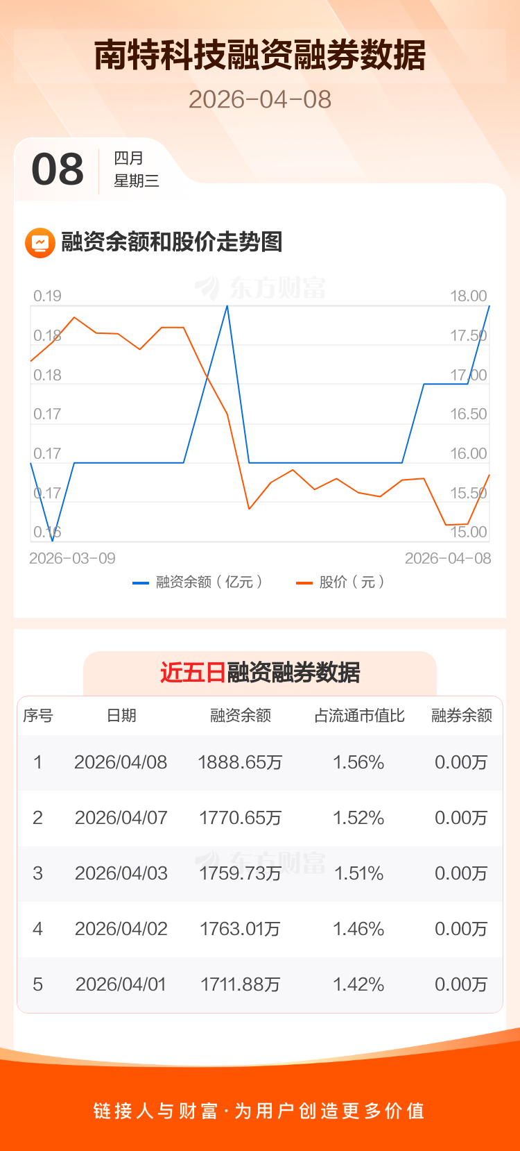 交易所最新数据显示,南特科技于2026年4月8日获融资买入175.54万元,融资偿还57.54万元,当日融资净买入118万元。目前,该股融资余额1888.65万,占流通市值比例为1.56%。