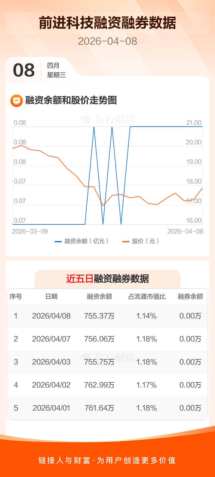 前进科技:融资净偿还6834元,融资余额755.37万元