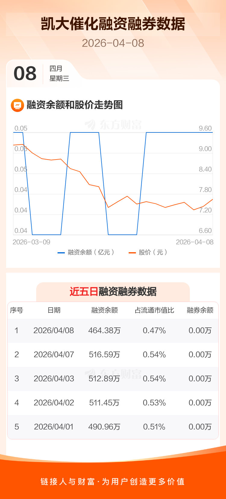 交易所最新数据显示,凯大催化于2026年4月8日获融资买入7610元,融资偿还52.97万元,当日融资净偿还52.21万元。目前,该股融资余额464.38万,占流通市值比例为0.47%。