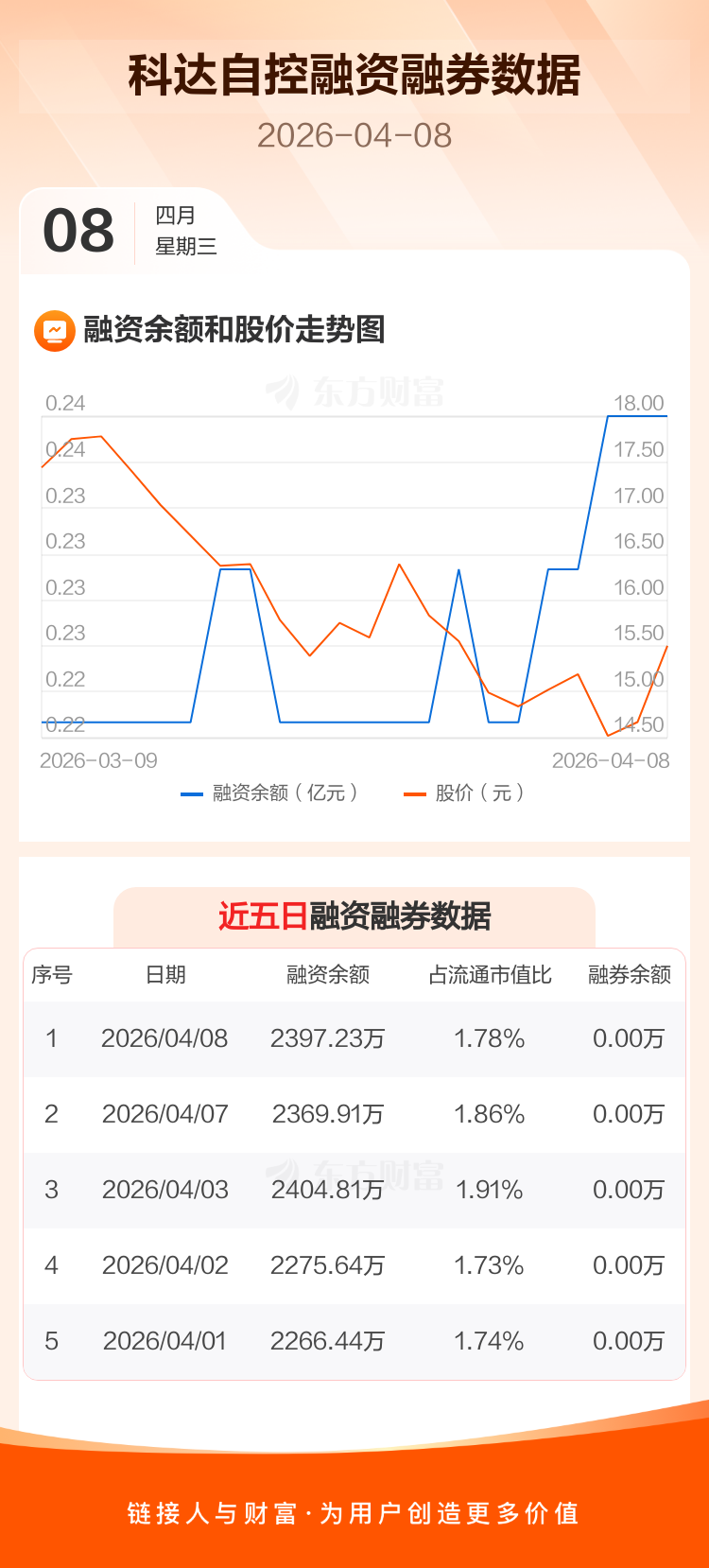 交易所最新数据显示,科达自控于2026年4月8日获融资买入72.80万元,融资偿还45.49万元,当日融资净买入27.31万元。目前,该股融资余额2397.23万,占流通市值比例为1.78%。
