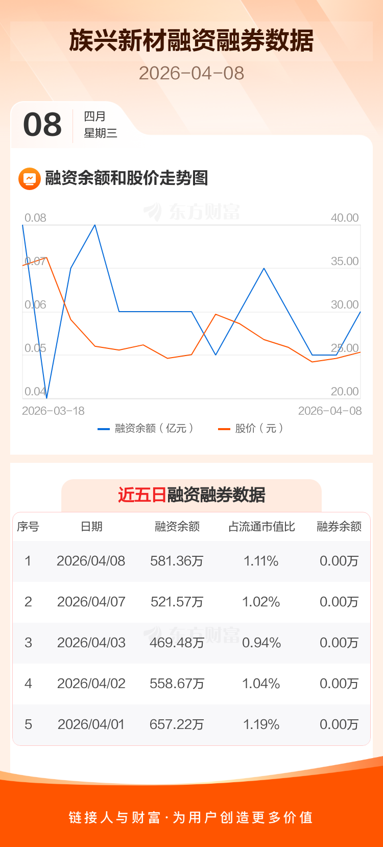 交易所最新数据显示,族兴新材于2026年4月8日获融资买入156.35万元,融资偿还96.56万元,当日融资净买入59.78万元。目前,该股融资余额581.36万,占流通市值比例为1.11%。