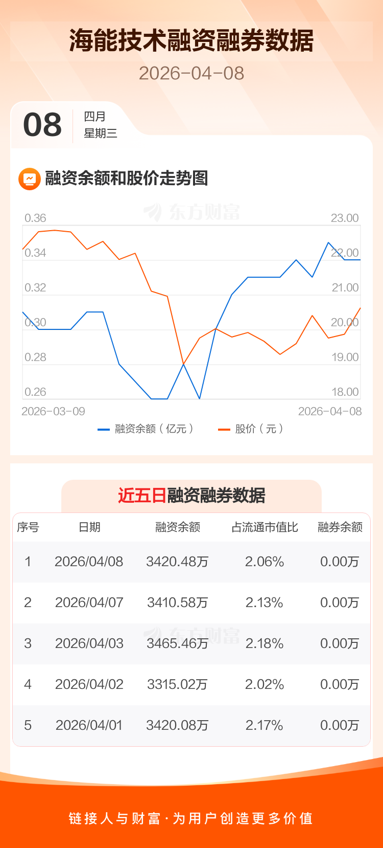 交易所最新数据显示,海能技术于2026年4月8日获融资买入168.96万元,融资偿还159.06万元,当日融资净买入9.9万元。目前,该股融资余额3420.48万,占流通市值比例为2.06%。