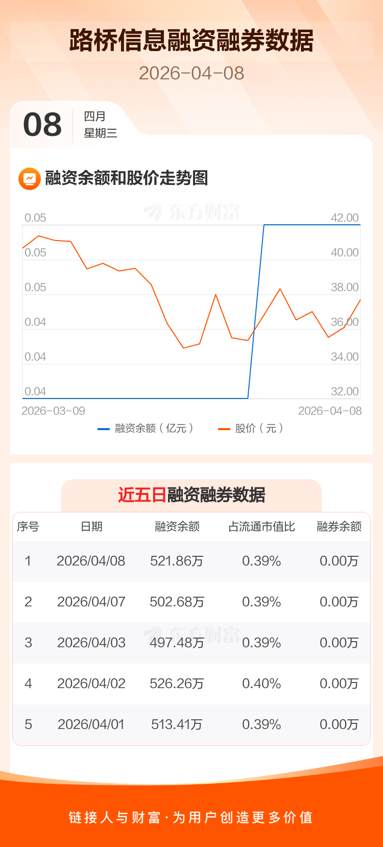 交易所最新数据显示,路桥信息于2026年4月8日获融资买入31.07万元,融资偿还11.89万元,当日融资净买入19.18万元。目前,该股融资余额521.86万,占流通市值比例为0.39%。