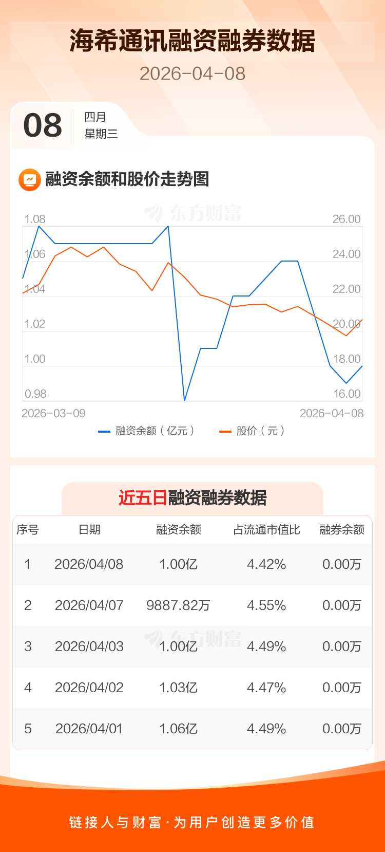 交易所最新数据显示,海希通讯于2026年4月8日获融资买入373.53万元,融资偿还218.34万元,当日融资净买入155.19万元。目前,该股融资余额1.00亿,占流通市值比例为4.42%。