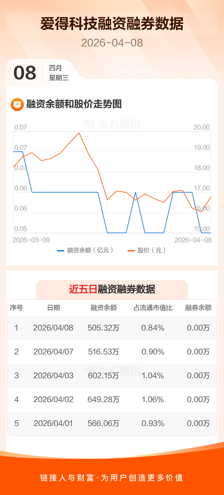 交易所最新数据显示,爱得科技于2026年4月8日获融资买入60.31万元,融资偿还71.53万元,当日融资净偿还11.22万元。目前,该股融资余额505.32万,占流通市值比例为0.84%。