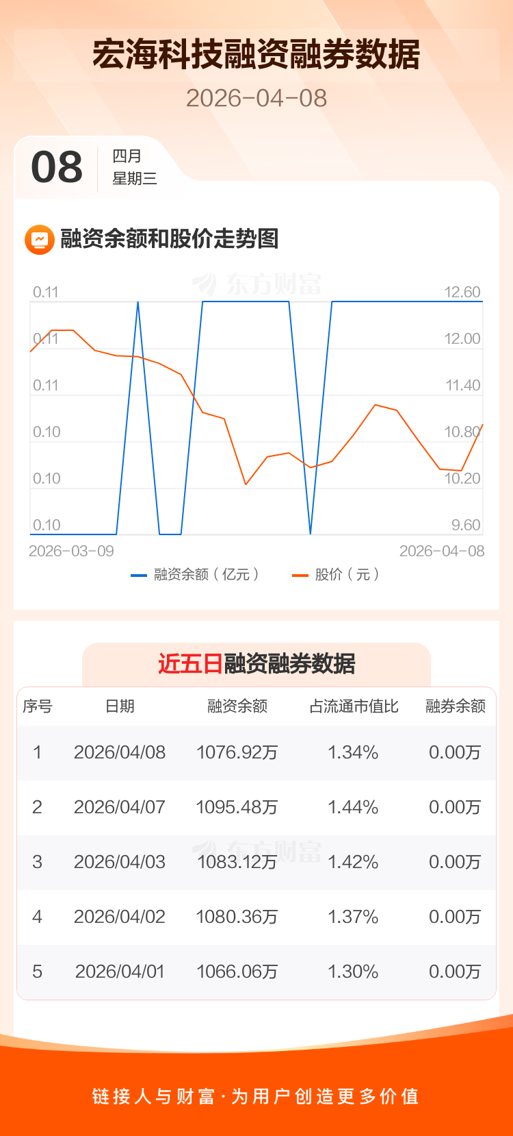 交易所最新数据显示,宏海科技于2026年4月8日获融资买入26.98万元,融资偿还45.55万元,当日融资净偿还18.57万元。目前,该股融资余额1076.92万,占流通市值比例为1.34%。
