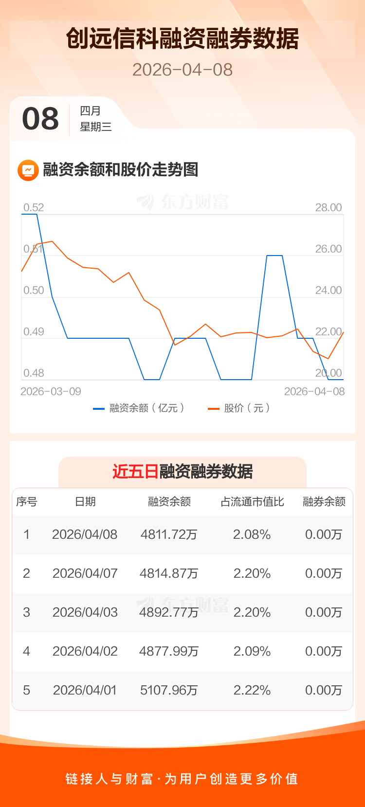 交易所最新数据显示,创远信科于2026年4月8日获融资买入128.78万元,融资偿还131.93万元,当日融资净偿还3.15万元。目前,该股融资余额4811.72万,占流通市值比例为2.08%。