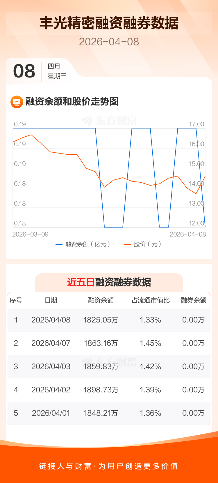 交易所最新数据显示,丰光精密于2026年4月8日获融资买入29.75万元,融资偿还67.87万元,当日融资净偿还38.12万元。目前,该股融资余额1825.05万,占流通市值比例为1.33%。