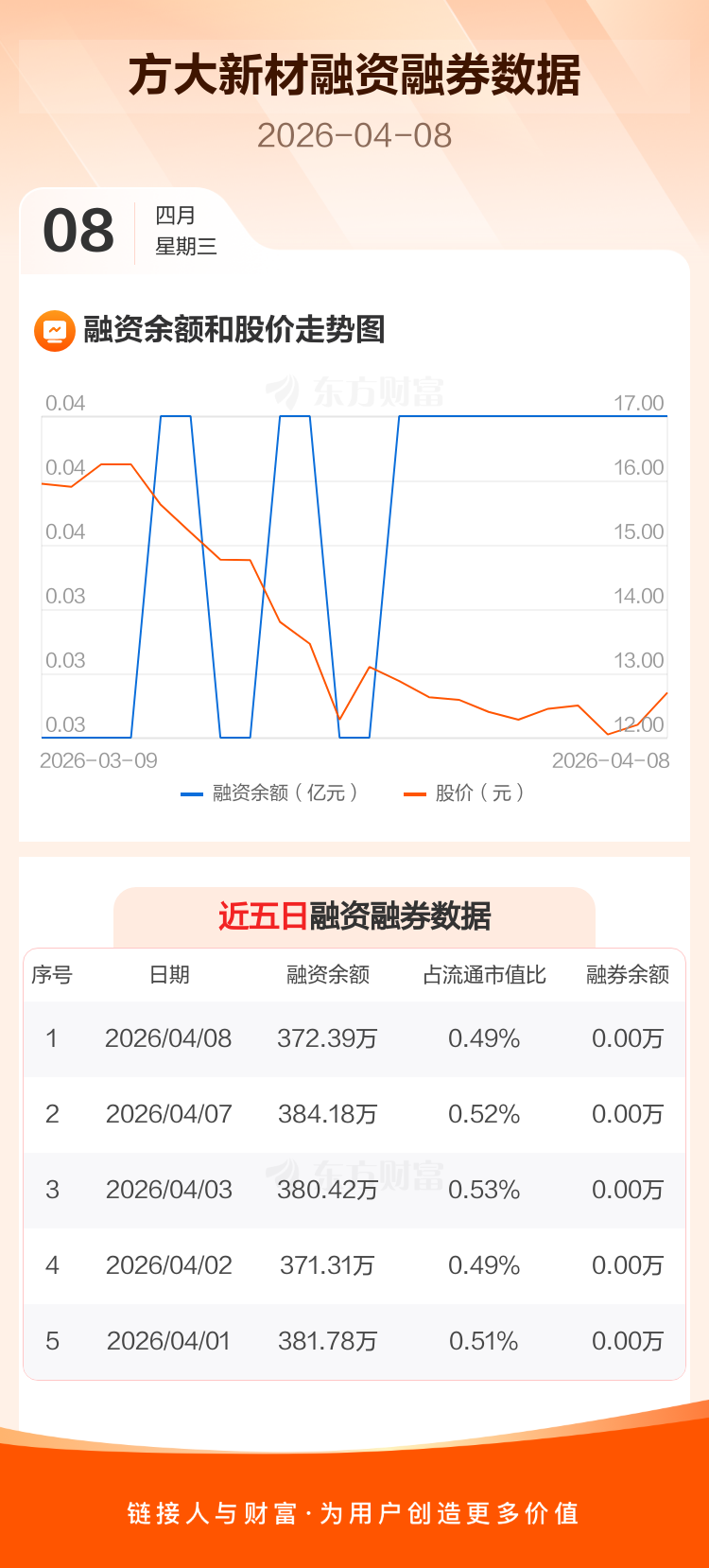 交易所最新数据显示,方大新材于2026年4月8日获融资买入40.54万元,融资偿还52.33万元,当日融资净偿还11.79万元。目前,该股融资余额372.39万,占流通市值比例为0.49%。