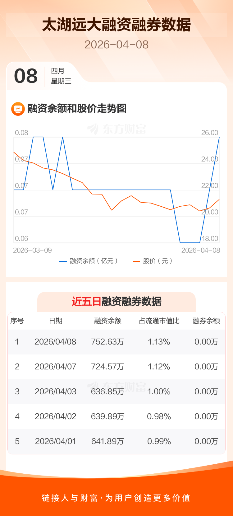 交易所最新数据显示,太湖远大于2026年4月8日获融资买入79.67万元,融资偿还51.61万元,当日融资净买入28.06万元。目前,该股融资余额752.63万,占流通市值比例为1.13%。